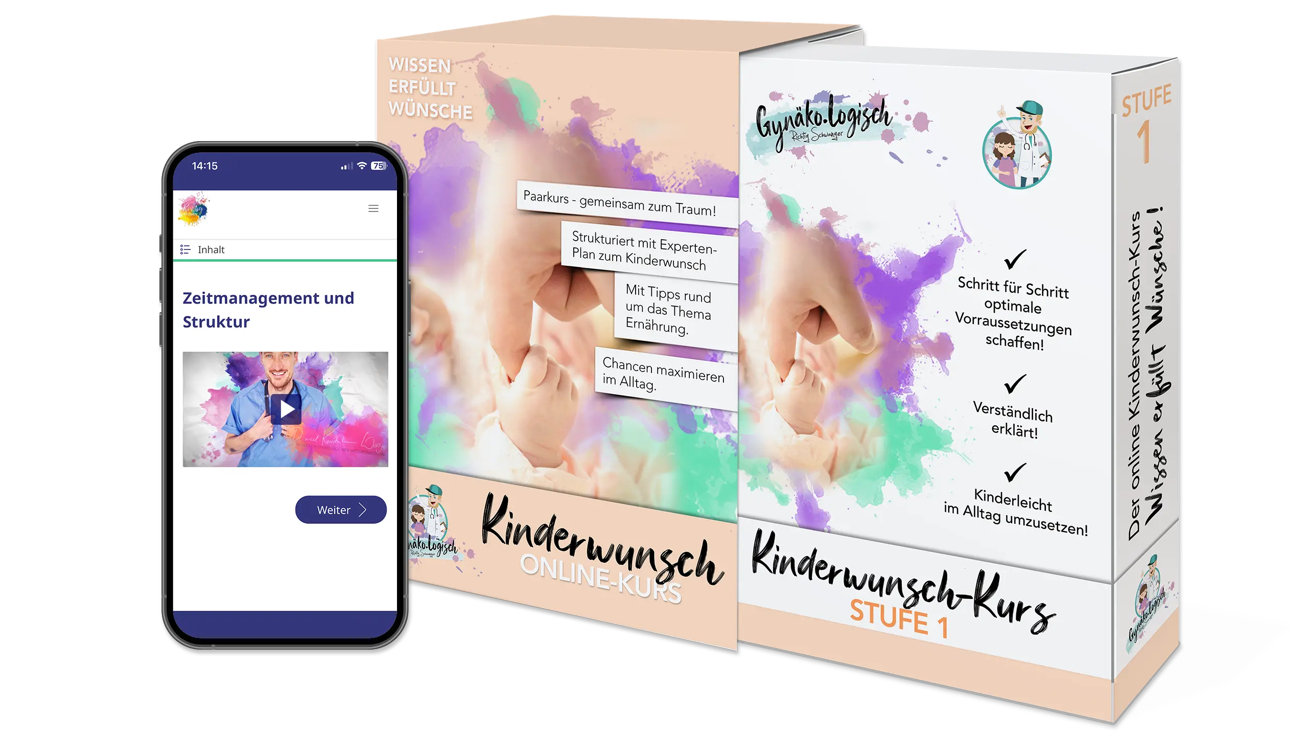 Die ers­te Kurs­stu­fe legt das Fun­da­ment für euren Kin­der­wunsch. Hier geht es dar­um, die bes­ten Vor­aus­set­zun­gen für eine Schwan­ger­schaft zu schaf­fen – kör­per­lich und men­tal. Dr. Wag­ner führt dich Schritt für Schritt durch fünf Fol­gen: