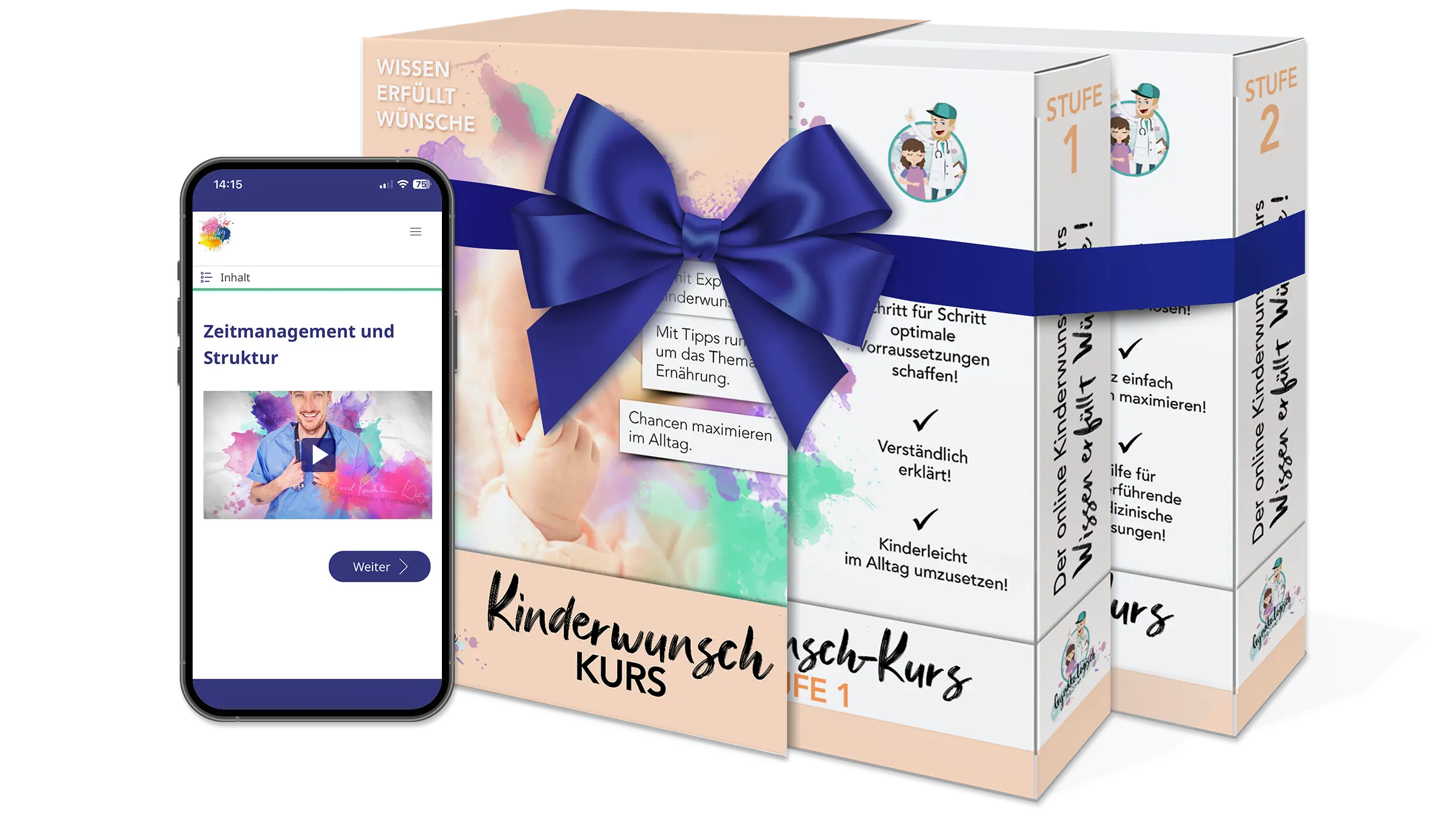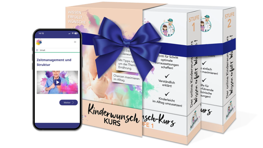 Wer bei­de Kurs­stu­fen zusam­men buchen möch­te, kann das Kin­der­wunsch Bund­le für 88,00 € bestel­len. Du bekommst damit alle 11 Fol­gen und sparst dir die Ent­schei­dung, ob du Stu­fe 2 nach­bu­chen sollst.